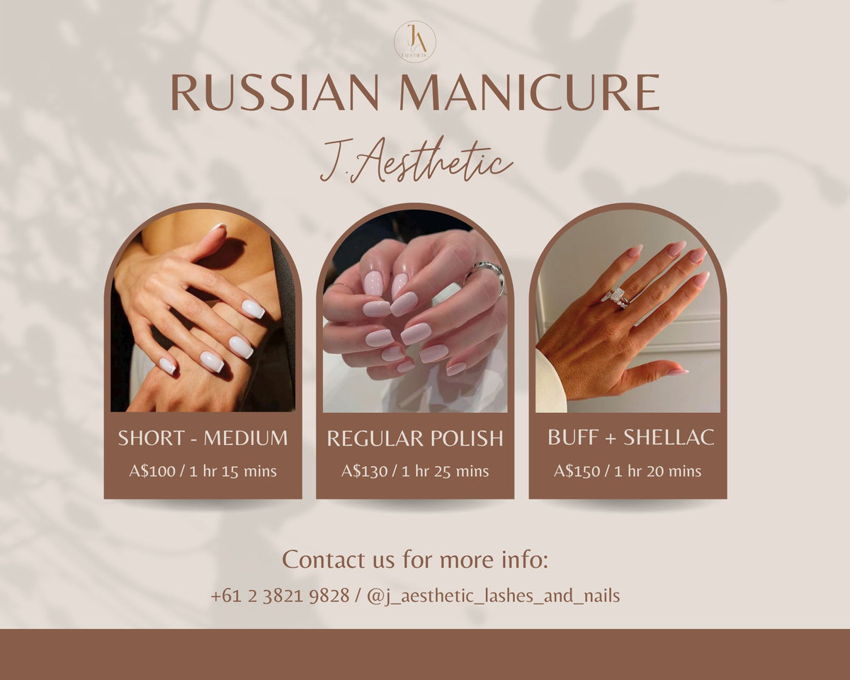 - Russian Manicure (Short–Medium): A$100 / 1h15